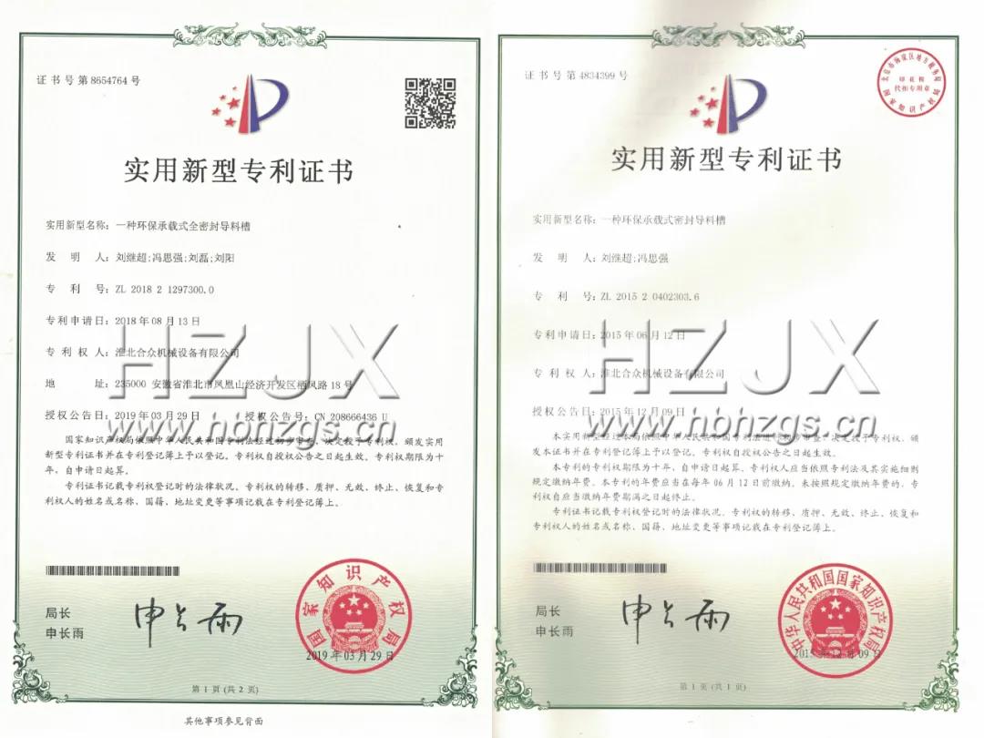此外,作為一家專注于智能環(huán)保輸送裝備粉塵治理的綜合性企業(yè),淮北合眾一直以來非常重視技術(shù)創(chuàng)新,其自主研發(fā)的“環(huán)保承載式全密封導(dǎo)料槽”榮獲由國家知識產(chǎn)權(quán)局頒發(fā)的兩項實用新型專利。