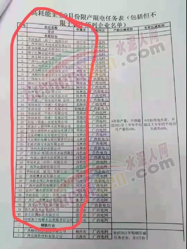 自治區(qū)將按旬實(shí)行節(jié)能調(diào)度,對于9月未完成限產(chǎn)任務(wù)進(jìn)度或超過產(chǎn)品能耗限額的企業(yè),立即停止當(dāng)月供電;對于未完成月限產(chǎn)任務(wù)的企業(yè),下月不再安排用電計(jì)劃。高耗能企業(yè)9月份限產(chǎn)限電任務(wù)表(包括但不限于表中所列企業(yè)名單)如下: