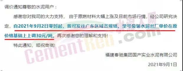 其中,福建春馳集團國產實業(yè)水泥有限公司通知稱,由于原燃材料大幅上漲及目前市場行情,經公司研究決定,自2021年9月2日零時起,發(fā)往廣東區(qū)域各規(guī)格、型號袋裝水泥出廠單價在原價格基礎上上調30元/噸。