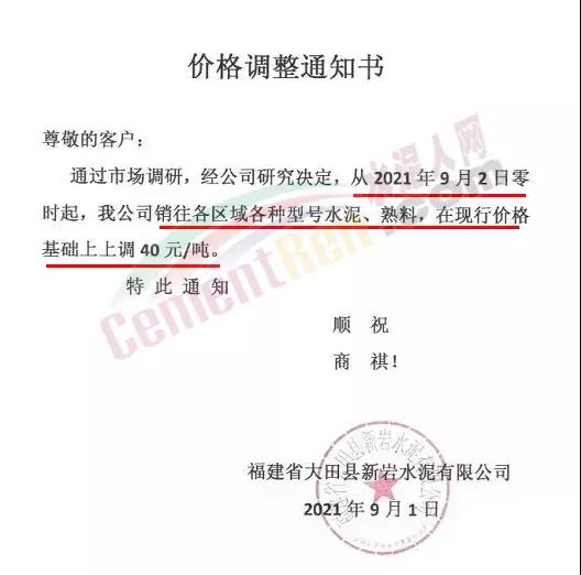 福建省大縣田新巖水泥有限公司通知通過市場調研,經公司研究決定,從9月2日零時起公司銷往各區(qū)域各型號水泥、熟料在現(xiàn)行價格基礎上上調40元/噸。