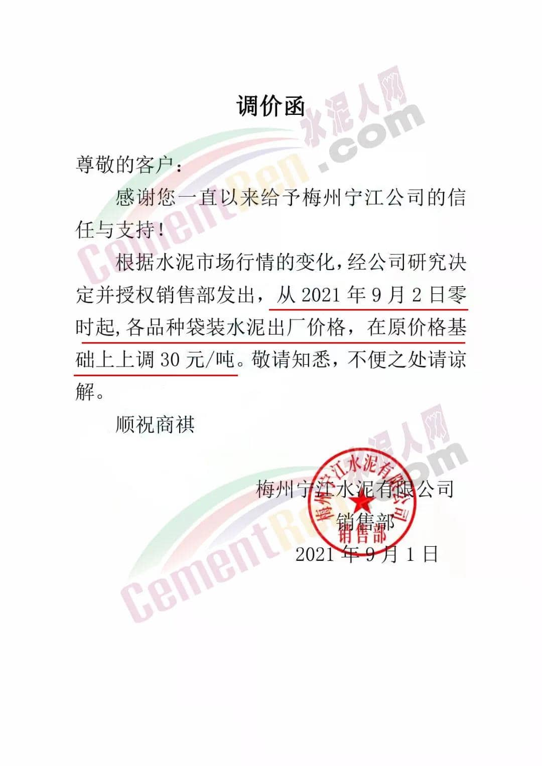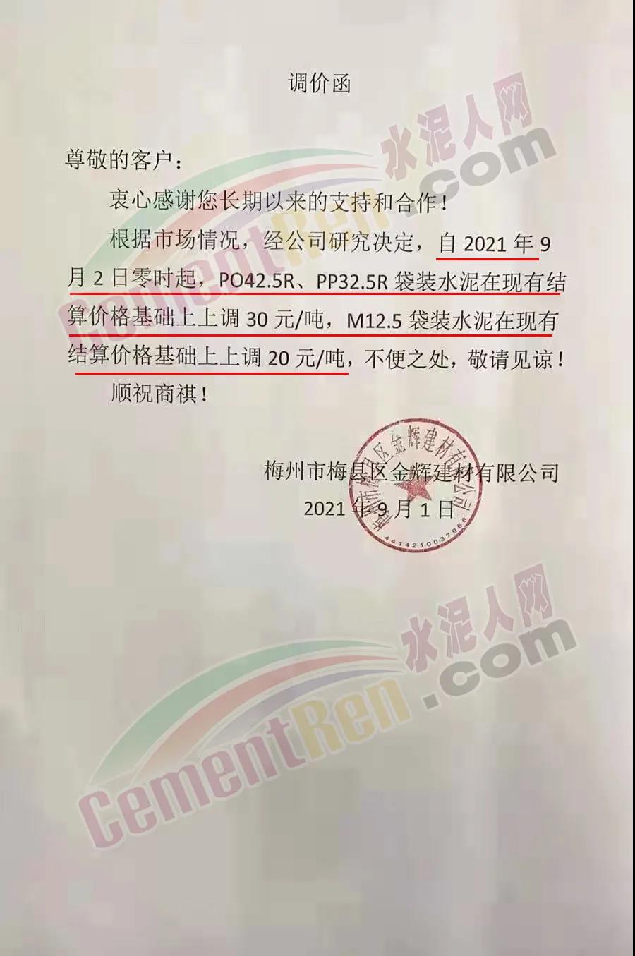 梅州市梅縣區(qū)金輝建材有限公司通知,自2021年9月2日零時起,PO42.5R、PP32.5R袋裝水泥在現(xiàn)有結算價格基礎上上調30元/噸,M12.5 袋裝水泥在現(xiàn)有結算價格基礎上上調 20 元/噸。