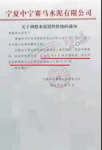 另據(jù)消息稱,寧夏區(qū)域多家品牌企業(yè)也于近日上調了水泥價格。寧夏吳忠賽馬新型建材有限公司通知 ,由于原材料采購價格持續(xù)上漲的原因,結合市場情況經公司研究決定 ,自2021年8月28日零時起,公司各品種規(guī)格水泥在原價基礎上上調20元/噸。