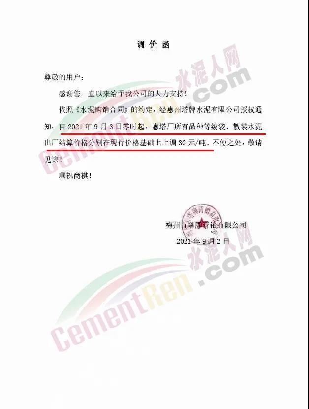 梅州塔牌營銷有限公司通知,依照《水泥購銷合同》的約定,經(jīng)惠州塔牌水泥有限公司授權(quán)通知,自2021年9月3日零時起,惠塔廠所有品種等級袋、散裝水泥出廠結(jié)算價格分別在現(xiàn)行價格基礎(chǔ)上上調(diào)30元/噸。