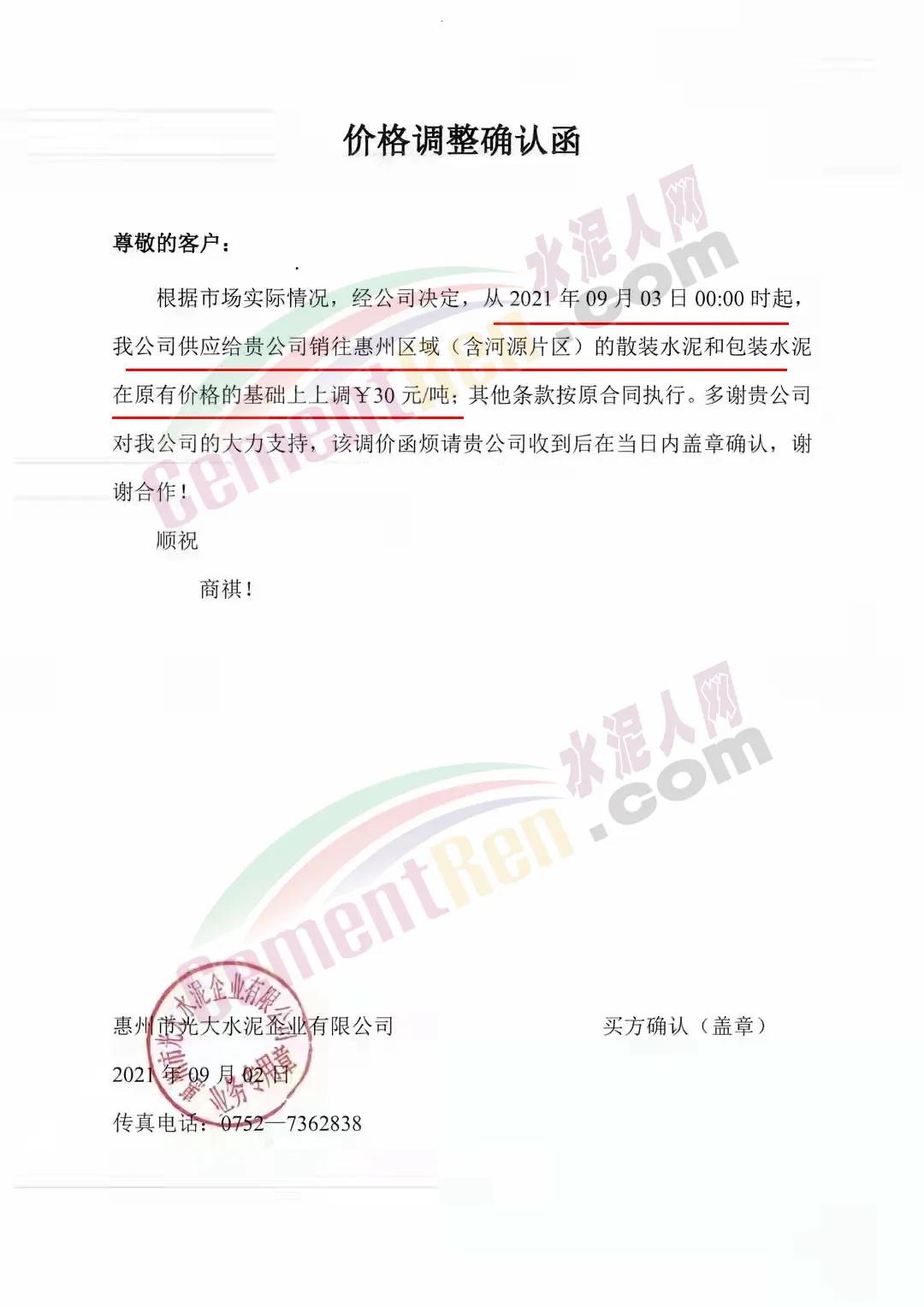 惠州市光大水泥企業(yè)有限公司通知,從2021年9月3日0時起,公司銷往惠州區(qū)域(含河源片區(qū))的散裝水泥和包裝水泥在原有價格的基礎(chǔ)上上調(diào)30元/噸。