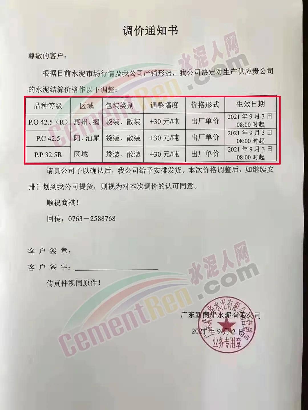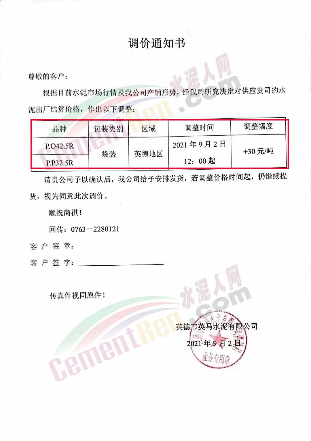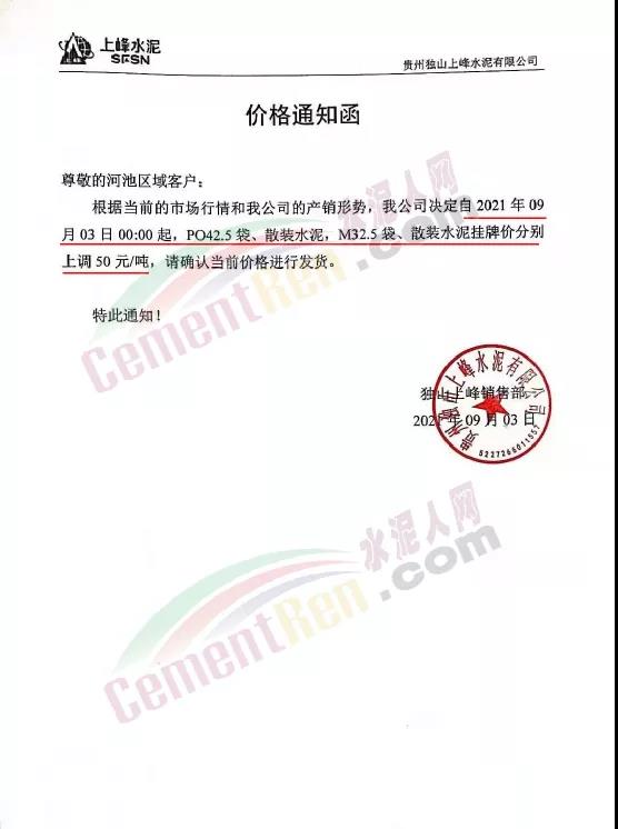 由于受各種原材料價格上升的影響,公司根據(jù)目前水泥的市場行情,經(jīng)研究決定從2021年9月2日下午18時起,公司供應(yīng)的PP32.5R包裝、散裝在原價的基礎(chǔ)上上調(diào)10元/噸。PO42.5R散裝在原價的基礎(chǔ)上上調(diào)10元/噸。