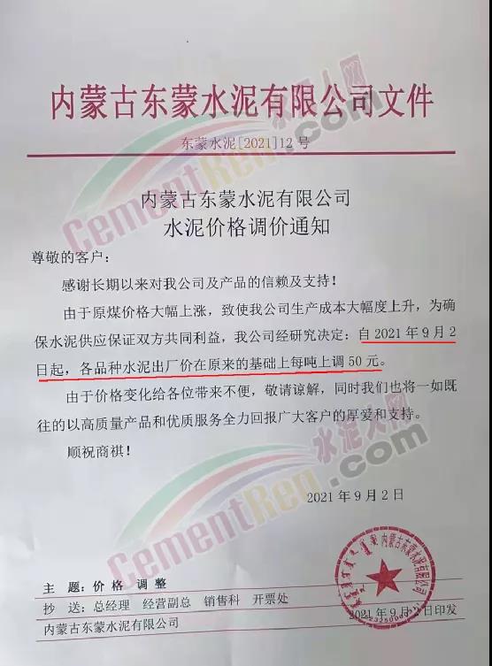 內(nèi)蒙古東蒙水泥有限公司通知由于原煤價格大幅上漲,致使公司生產(chǎn)成本大幅度上升。為確保水泥供應(yīng),經(jīng)研究決定自2021年9月2日起,各品種水泥出廠價在原來的基礎(chǔ)上每噸上調(diào)50元。