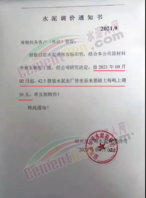 紹興萬年青水泥通知根據(jù)目前水泥銷售市場形勢,結(jié)合本公司原材料價格大幅度上漲,經(jīng)公司研究決定,自2021年9月2日起,42.5散裝水泥出廠價在原來基礎(chǔ)上每噸上調(diào)30元。