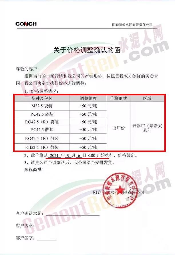陽(yáng)春海螺水泥有限責(zé)任公司通知,云浮市區(qū)域(除新興縣)自9月6日8時(shí)各標(biāo)號(hào)水泥起上調(diào)50元/噸。