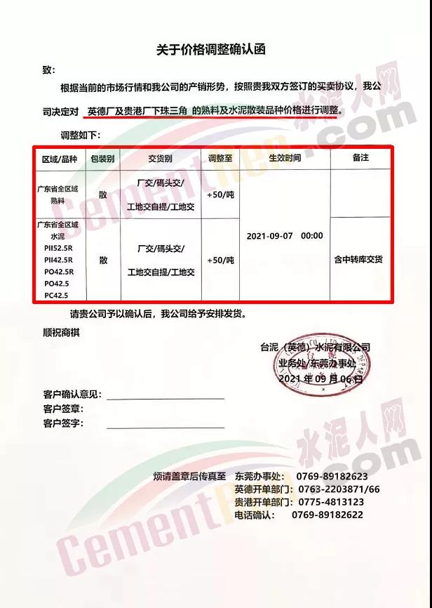 臺(tái)泥(英德)水泥有限公司通知,從9月7日0時(shí)起廣東省全區(qū)域各標(biāo)號(hào)散裝水泥及熟料價(jià)格上調(diào)50元/噸。