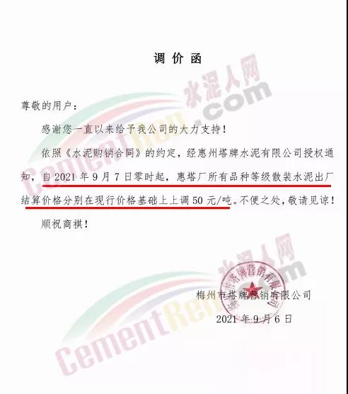 惠州市力塔水泥有限公司通知,根據(jù)市場(chǎng)行情及各種原材料價(jià)格持續(xù)上漲,經(jīng)公司研究決定從2021年9月7日上午8時(shí)起,公司生產(chǎn)的PO42.5R等級(jí)水泥和P.P32.5R等級(jí)水泥及M32.5等級(jí)水泥在原有價(jià)格的基礎(chǔ)上上調(diào)50元/噸。