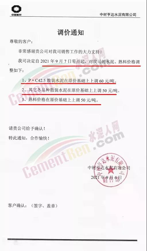 中材亨達(dá)水泥有限公司通知,自9月7日零點(diǎn)起,公司水泥、熟料價(jià)格上調(diào)50-60元/噸。