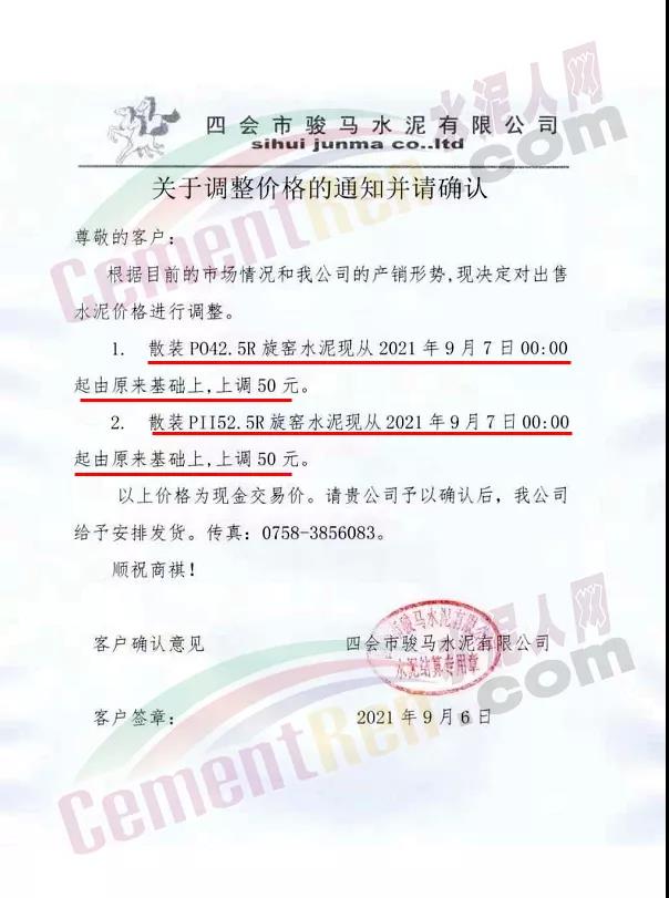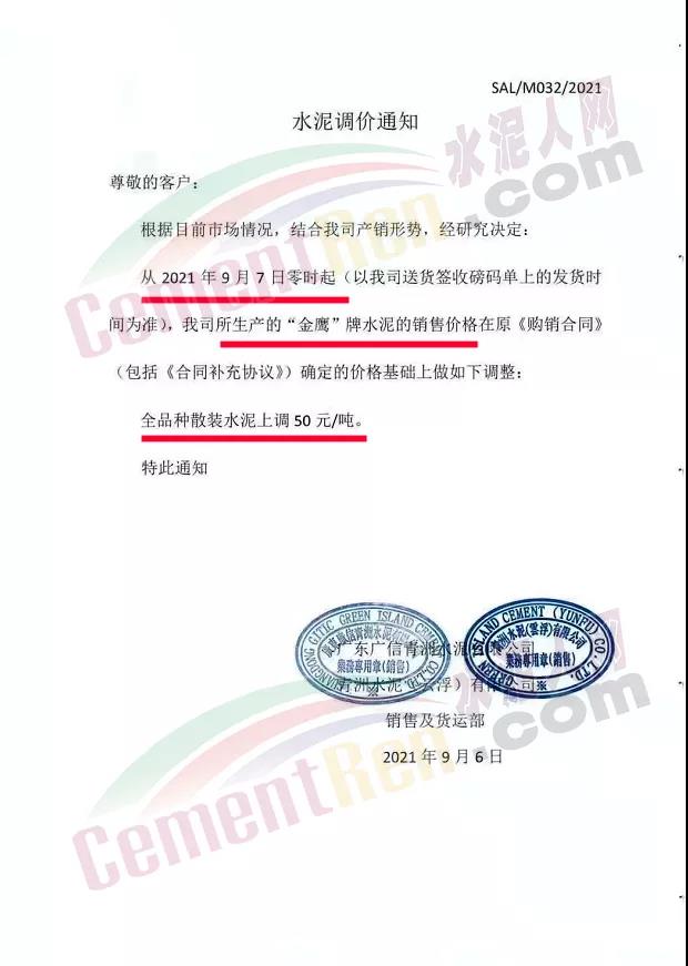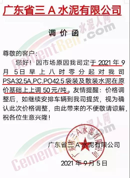 廣東省三A水泥有限公司通知,因市場(chǎng)原因公司定于2021年9月5日早上8時(shí)零分起對(duì)公司PSA32.5A,PC,PO42.5袋裝及散裝水泥在原價(jià)基礎(chǔ)上上調(diào)50元/噸。