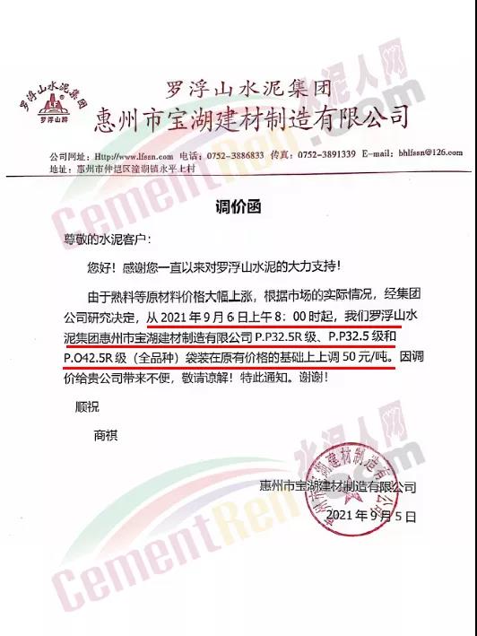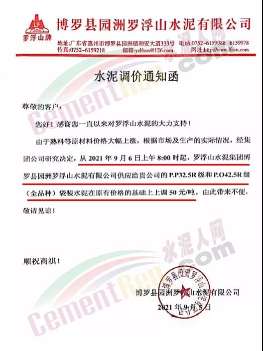 博羅縣園洲羅浮山水泥有限公司通知由于熟料等原材料價(jià)格大幅上漲,根據(jù)市場(chǎng)及生產(chǎn)的實(shí)際情況,經(jīng)集團(tuán)公司研究決定從2021年9月6日上午8時(shí)起,羅浮山水泥集團(tuán)博羅縣園洲羅浮山水泥有限公司供應(yīng)給貴公司的P.P32.5R級(jí)和P.O42.5R級(jí)(全品種)袋裝水泥在原有價(jià)格的基礎(chǔ)上上調(diào)50元/噸。