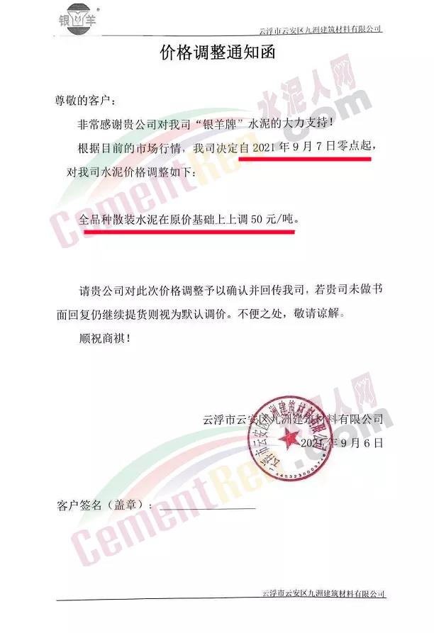 云浮市云安區(qū)九洲建筑材料有限公司通知自9月7日零點(diǎn)起,全品種散裝水泥上調(diào)50元/噸。
