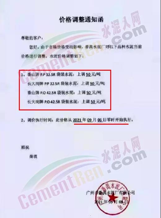 廣州市番禹水泥廠有限公司通知,由于市場(chǎng)價(jià)格變動(dòng)影響,對(duì)旗下番山牌和長(zhǎng)大崗牌各標(biāo)號(hào)水泥自9月6日起上調(diào)50元/噸。