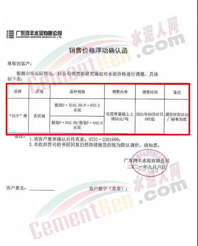 廣東鴻豐水泥有限公司通知,根據(jù)市場(chǎng)實(shí)際情況,經(jīng)公司銷售部研究確定自9月7日0時(shí)起對(duì)旗下各區(qū)域“鴻豐”牌散裝水泥上調(diào)50元/噸。