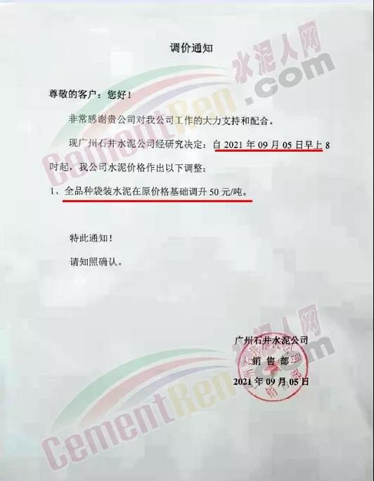 廣州石井水泥公司通知,自9月5日8時(shí)起,全品種袋裝水泥上調(diào)50元/噸。