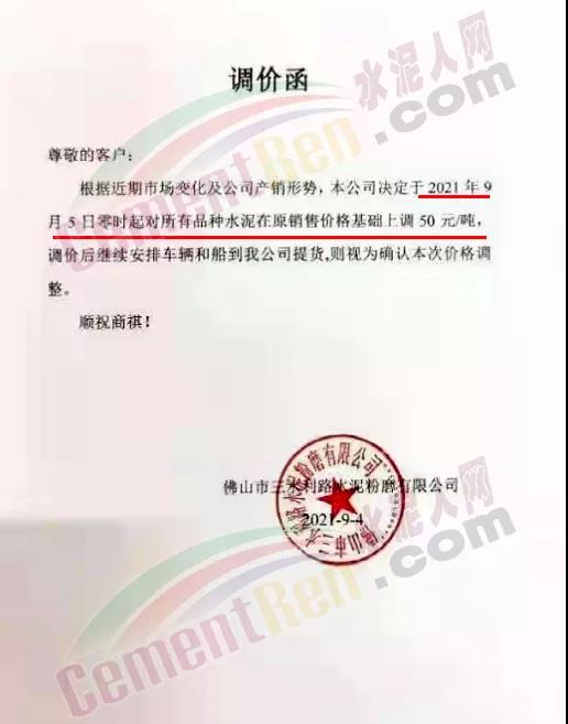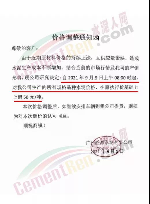 廣州勝源水泥有限公司通知,由于近期材料價(jià)格持續(xù)上漲,且供應(yīng)量緊缺,造成水泥生產(chǎn)成本不斷增加,結(jié)合當(dāng)前的市場(chǎng)行情及公司的產(chǎn)銷形勢(shì),公司研究決定自9月5日上午8時(shí)起,對(duì)所有規(guī)格品種水泥價(jià)格,在原執(zhí)行價(jià)格基礎(chǔ)上上調(diào)50元/噸。