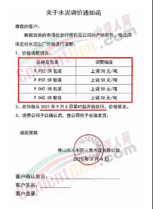 佛山市三水區(qū)三鹿水泥有限公司通知,根據(jù)當(dāng)前的市場(chǎng)信息和公司的產(chǎn)銷形勢(shì),公司決定自9月5日零時(shí)起對(duì)旗下各標(biāo)號(hào)水泥價(jià)格上調(diào)50元/噸。