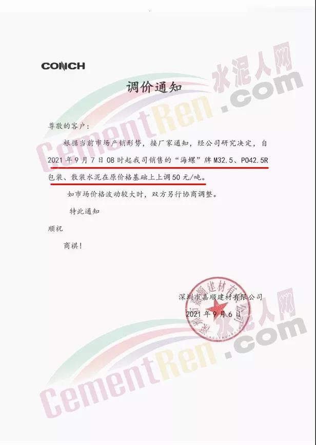 深圳市嘉順建材有限公司通知,根據(jù)當(dāng)前市場(chǎng)產(chǎn)銷形勢(shì),經(jīng)公司研究決定自9月7日8時(shí)起公司銷售銷售的“海螺”牌M32.5、P.O42.5R包裝、散裝水泥在原價(jià)格基礎(chǔ)上上調(diào)50元/噸。