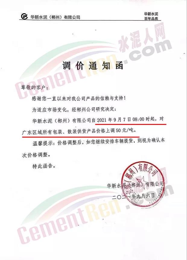 華新水泥郴州有限公司通知稱,自9月7日8時(shí)起,對(duì)廣東區(qū)域所有包裝、散裝供貨價(jià)格上調(diào)50元/噸。