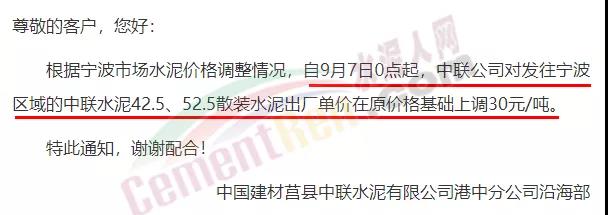 中國(guó)建材莒縣中聯(lián)水泥有限公司港中分公司沿海部通知根據(jù)寧波市場(chǎng)水泥價(jià)格調(diào)整情況,自9月7日0點(diǎn)起,中聯(lián)公司對(duì)發(fā)往寧波區(qū)域的中聯(lián)水泥42.5、52.5散裝水泥出廠單價(jià)在原價(jià)格基礎(chǔ)上上調(diào)30元/噸。