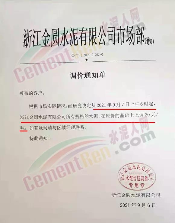 浙江金圓水泥有限公司市場(chǎng)部通知,自9月7日上午6時(shí)起,公司所有規(guī)格的水泥在原價(jià)基礎(chǔ)上上調(diào)30元/噸。