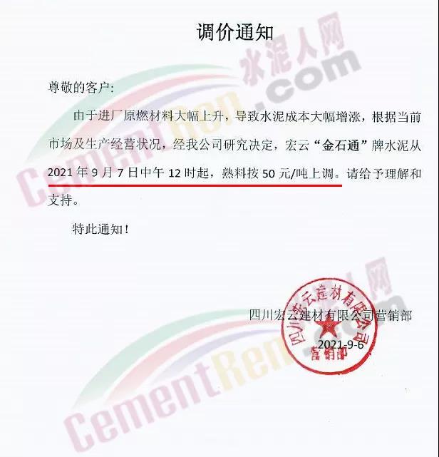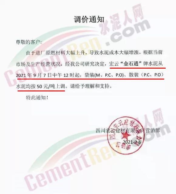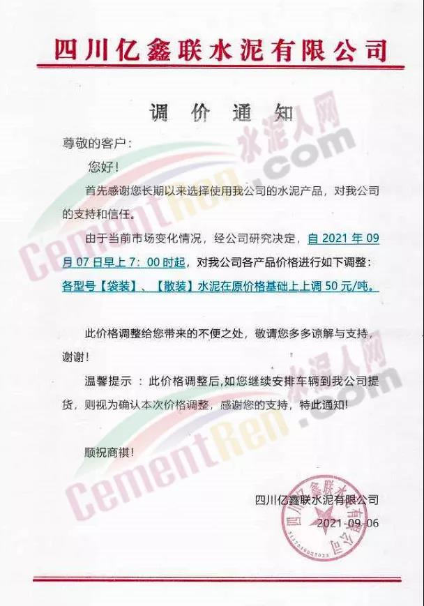四川億鑫聯(lián)水泥有限公司通知自9月7日7時(shí)起,公司各型號(hào)規(guī)格水泥在原價(jià)基礎(chǔ)上上調(diào)50元/噸。