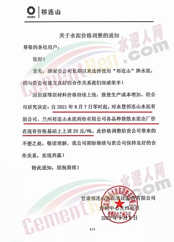 甘肅祁連山水泥集團(tuán)股份有限公司通知,因原煤等原材料價(jià)格持續(xù)上漲,致使生產(chǎn)成本增加,經(jīng)公司研究決定自9月7日0時(shí)起,對(duì)永登祁連山水泥有限公司、蘭州祁連山水泥商砼有限公司各品種袋散裝水泥出廠價(jià)上調(diào)20元/噸。