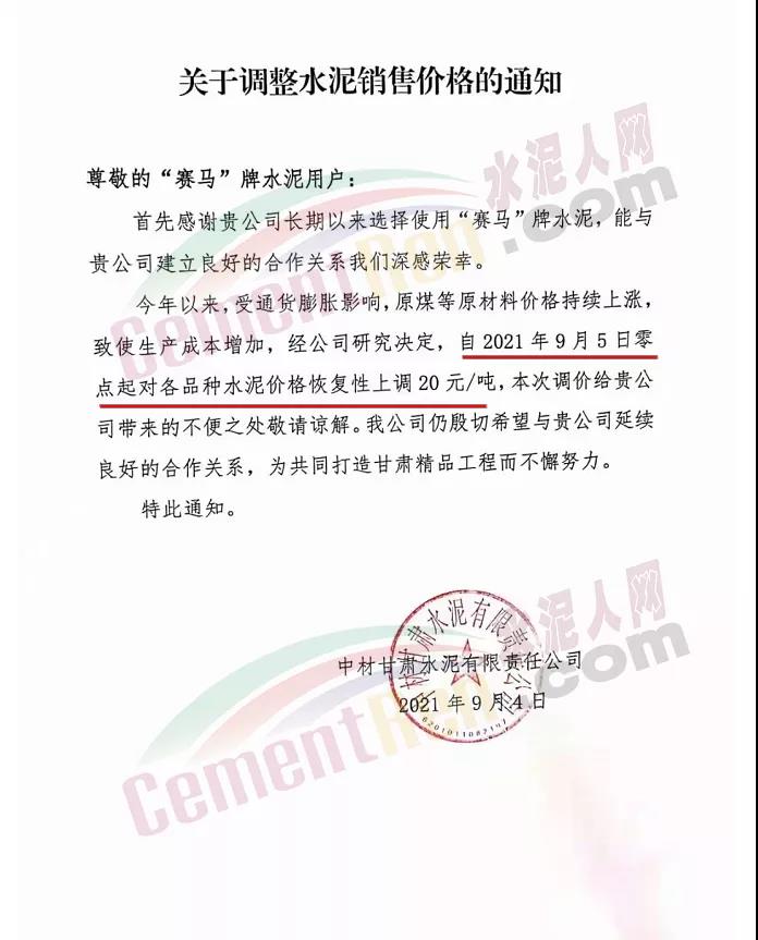 中材甘肅水泥有限責(zé)任公司通知,自9月5日零時(shí)起對(duì)各品種水泥價(jià)格恢復(fù)性上調(diào)20元/噸。
