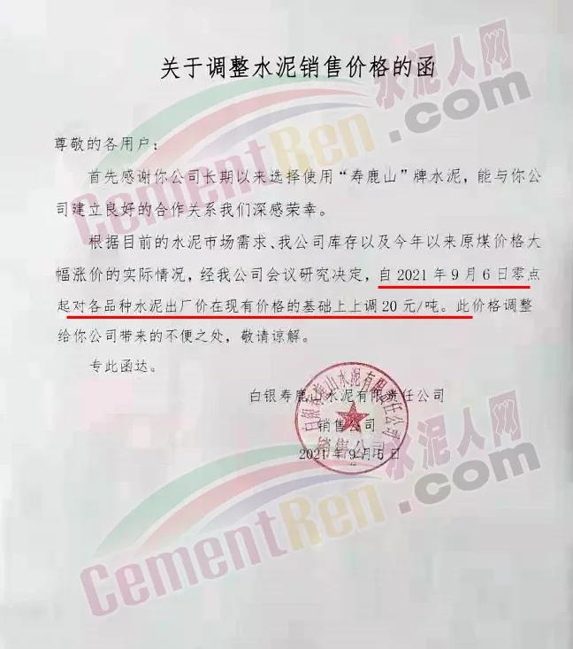 白銀壽鹿山水泥有限責(zé)任公司通知,自9月6日零點(diǎn)起對(duì)各品種水泥出廠價(jià)上調(diào)20元/噸。