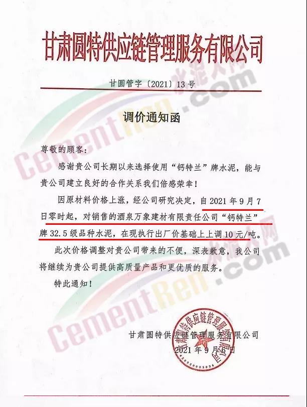 甘肅圓特供應(yīng)鏈管理服務(wù)有限公司通知,自9月7日零時(shí)起,對(duì)銷售的酒泉萬(wàn)象建材有限責(zé)任公司“鈣特蘭”牌32.5級(jí)品種水泥上調(diào)10元/噸。