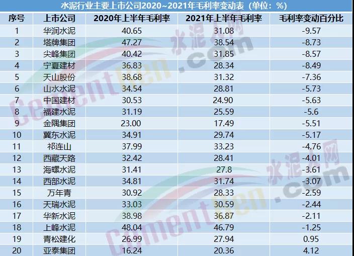 毛利率是企業(yè)在直接生產(chǎn)過(guò)程中的獲利能力的財(cái)務(wù)反映,代表了企業(yè)核心競(jìng)爭(zhēng)力。據(jù)水泥人網(wǎng)不完全統(tǒng)計(jì),截止至9月9日,水泥行業(yè)20家發(fā)布半年報(bào)的上市公司中,有17家出現(xiàn)了毛利率下滑的現(xiàn)象,占比約為86%,其中,華潤(rùn)水泥毛利率下滑幅度最大,約為9.57%。