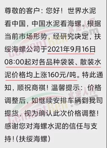 扶綏海螺通知,于9月16日8時(shí)起對(duì)各品種袋裝、散裝水泥價(jià)格均上漲160元/噸。