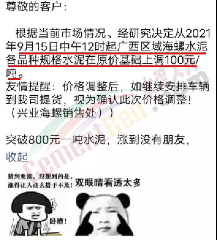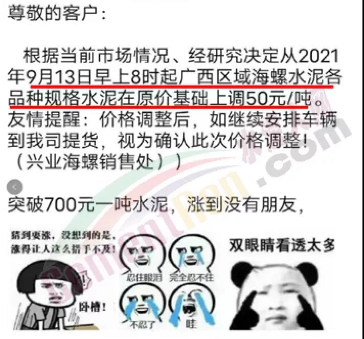 興業(yè)海螺銷(xiāo)售處通知,根據(jù)當(dāng)前市場(chǎng)情況,經(jīng)研究決定從9月15日中午12時(shí)起廣西區(qū)域海螺水泥各品種規(guī)格水泥上調(diào)100元/噸。前一日曾通知自9月13日早8時(shí)起,廣西區(qū)域海螺水泥各品種規(guī)格水泥在原價(jià)基礎(chǔ)上上調(diào)50元/噸。經(jīng)銷(xiāo)商表示,即將漲到800元/噸,漲到?jīng)]朋友了!