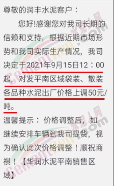 華潤(rùn)水泥平南銷(xiāo)售區(qū)域通知,根據(jù)近期市場(chǎng)形勢(shì)和公司實(shí)際生產(chǎn)情況,決定于2021年9月15日12時(shí)起,對(duì)發(fā)平南區(qū)域袋裝、散裝各品種水泥出廠價(jià)格上調(diào)50元/噸。