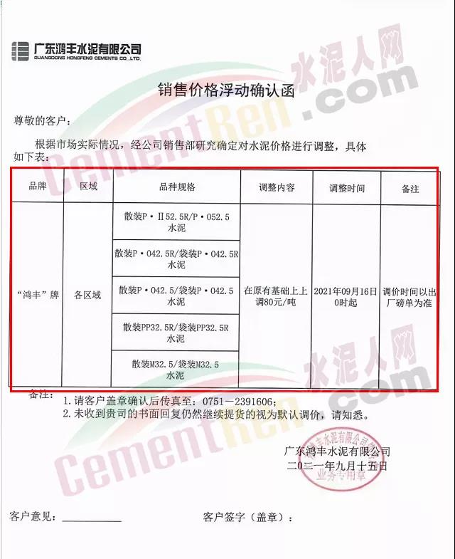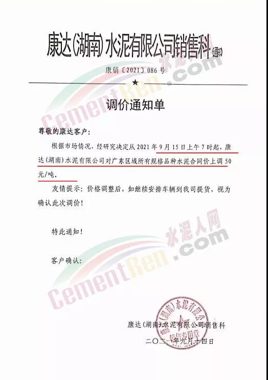 臺(tái)泥(英德)水泥有限公司通知,自9月16日0時(shí)起,英德廠及貴港廠下珠三角的熟料及水泥全品種價(jià)格上調(diào)80元/噸。