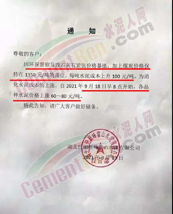 湖北世紀(jì)新峰雷山水泥通知自9月18日起上調(diào)各品種水泥價(jià)格60-80元/噸。