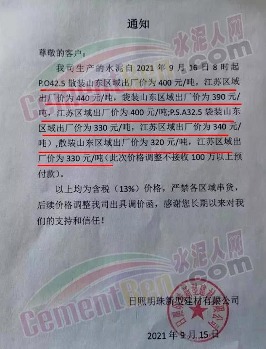 日照明珠新型建材有限公司通知自9月16日8時(shí)起P.O42.5散裝山東區(qū)域出廠價(jià)為400元/噸,江蘇區(qū)域出廠價(jià)為440元/噸,袋裝山東區(qū)域出廠價(jià)為390元/噸,江蘇區(qū)域出廠價(jià)為400元/噸;PS.A32.5袋裝山東區(qū)域出廠價(jià)為330元/噸,江蘇區(qū)域出廠價(jià)為340元/噸,散裝山東區(qū)域出廠價(jià)為320元/噸,江蘇區(qū)域出廠價(jià)為330元/噸(此次價(jià)格調(diào)整不接收100萬(wàn)以上預(yù)付款)。