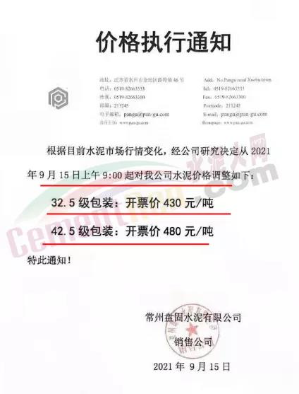 江蘇常州盤(pán)固水泥有限公司銷(xiāo)售公司通知,9月15日上午9時(shí)對(duì)公司水泥價(jià)格進(jìn)行調(diào)整,調(diào)整后42.5包裝開(kāi)票價(jià)480元/噸。