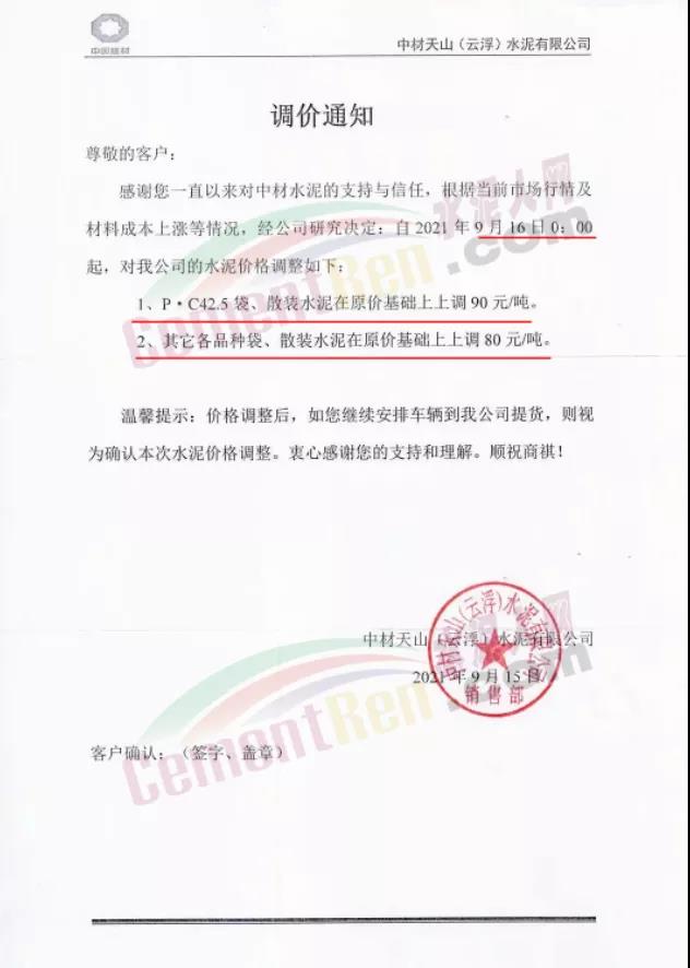 中材天山(云?。┧嘤邢薰就ㄖ?月16日0時(shí)起P.C42.5級(jí)水泥上調(diào)90元/噸,其他各品牌水泥上調(diào)80元/噸。