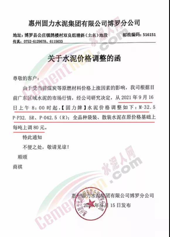 惠州固力水泥集團(tuán)有限公司博羅分公司通知,9月16日上午8時(shí)起各標(biāo)號(hào)水泥上調(diào)80元/噸。