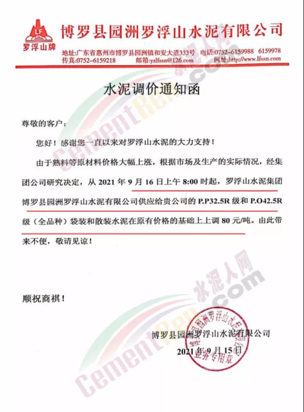 博羅縣園洲羅浮山水泥有限公司通知,9月16日上午8時(shí)起各標(biāo)號(hào)水泥上調(diào)80元/噸。