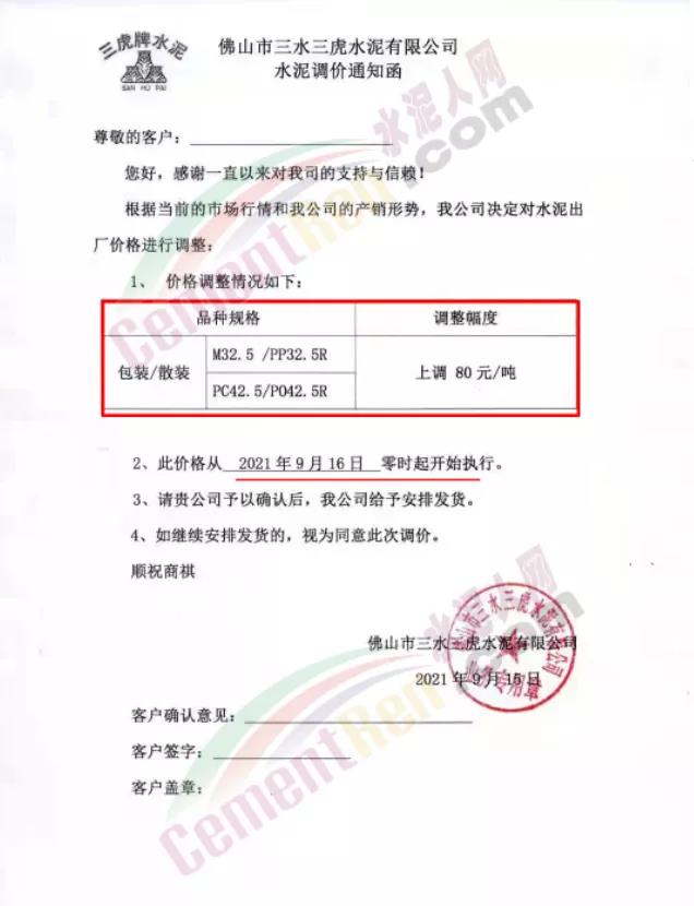 佛山市 三水三虎水泥通知9月16日起上調(diào)各標(biāo)號(hào)水泥80元/噸。