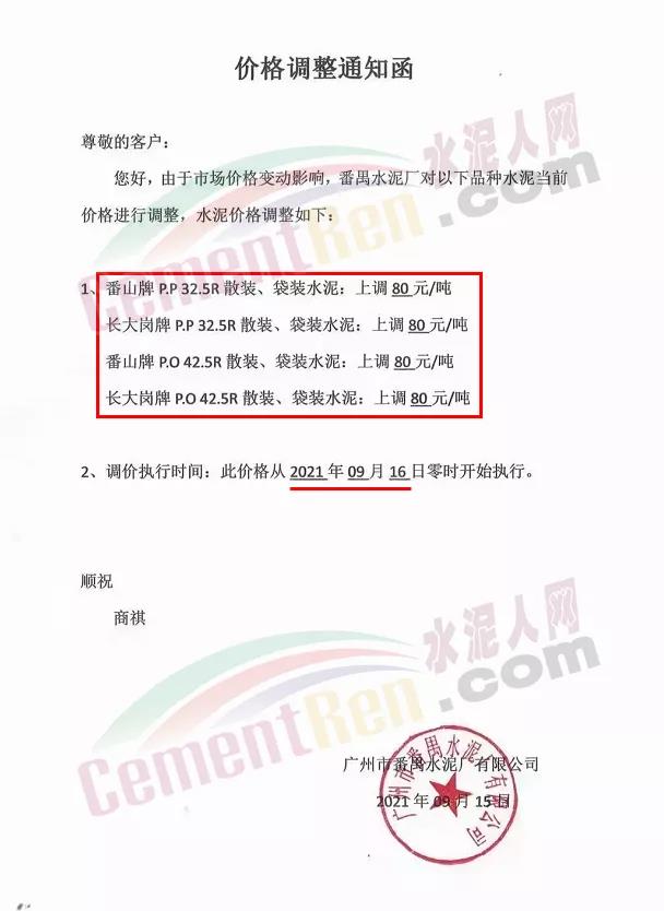廣州市番禺水泥廠通知自9月16日起各標(biāo)號(hào)水泥上調(diào)80元/噸。