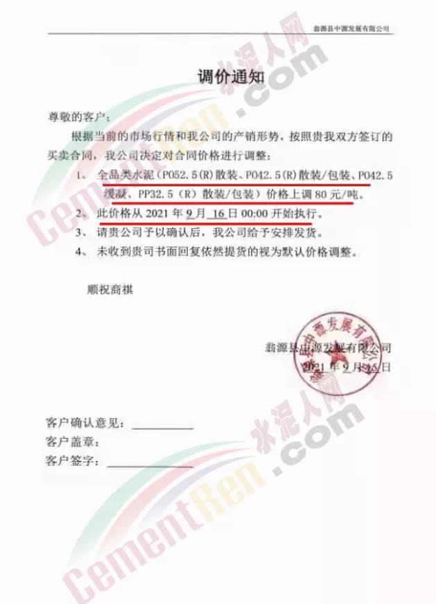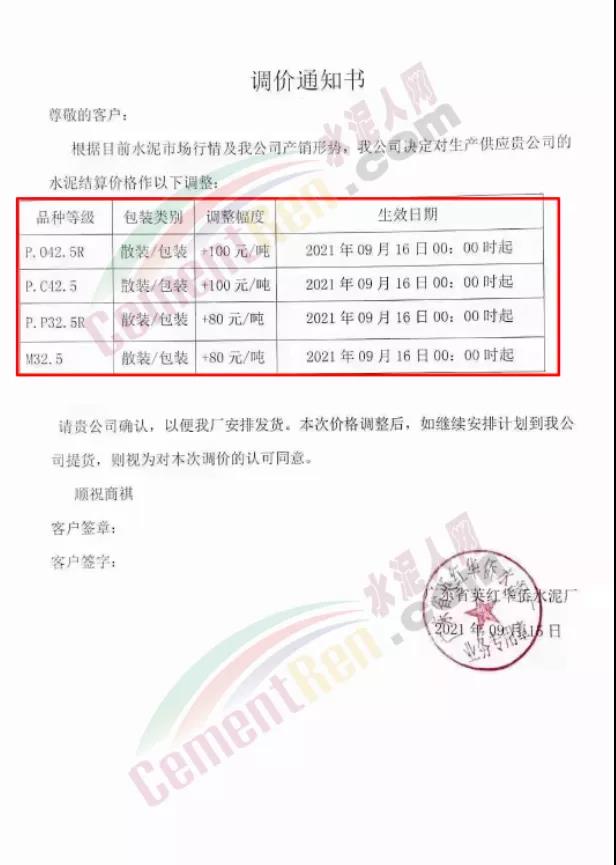 英德市恒業(yè)建材有限公司通知9月16日零時(shí)起,公司各標(biāo)號(hào)水泥上調(diào)80元/噸。