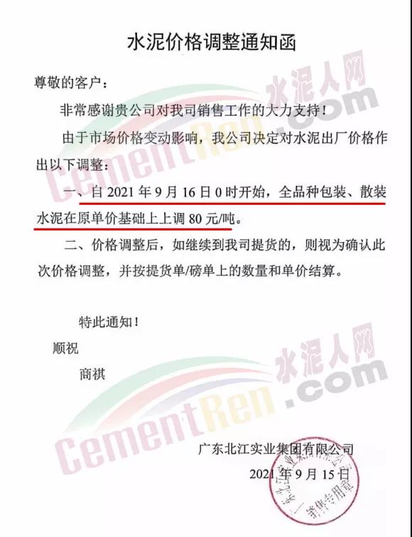 廣東北江實(shí)業(yè)集團(tuán)有限公司通知9月16日0時(shí)開(kāi)始,全品種水泥上調(diào)80元/噸。