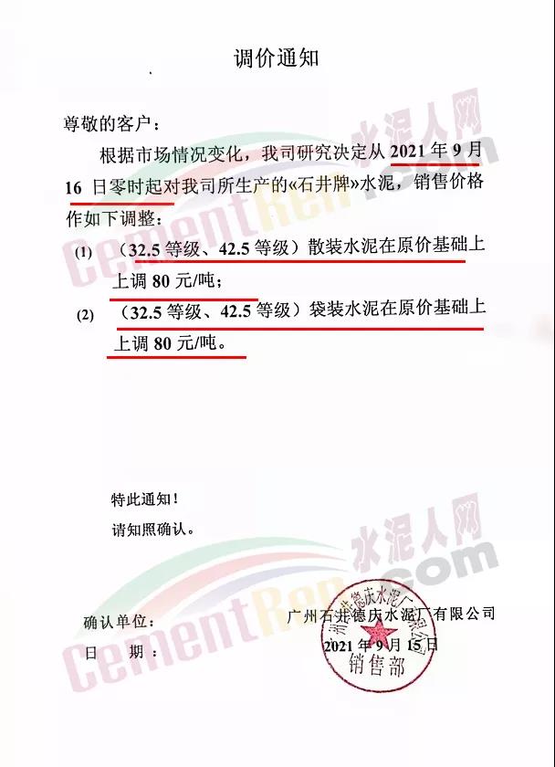 廣州石井水泥公司通知,9月16日0時(shí)起,各標(biāo)號(hào)水泥上調(diào)80元/噸。