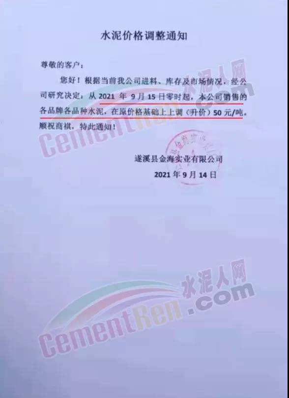 廣東省湛江市遂溪縣金海實(shí)業(yè)有限公司通知9月15日0時(shí)起,公司銷(xiāo)售各品牌各品種水泥,在原價(jià)格基礎(chǔ)上上調(diào)50元/噸。