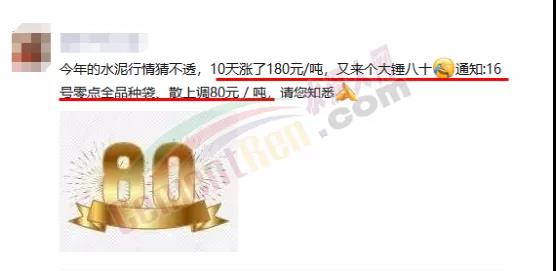 400、500、600、700、800......“天價(jià)水泥”的傳說(shuō)在各地陸續(xù)上演,有經(jīng)銷(xiāo)商調(diào)侃稱(chēng),“這樣下去水泥要成金泥論克賣(mài)了”。商混攪拌站經(jīng)營(yíng)者則說(shuō)“水泥瘋了,完全就是無(wú)序漲價(jià),一日兩漲,兩日一漲,一漲上百,完全顛覆下游企業(yè)的認(rèn)知”。